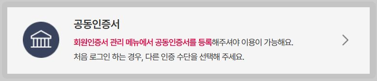 회원인증서 관리 메뉴에서 공동인증서를 등록해주셔야 이용이 가능해요.처음 로그인 하는 경우, 다른 인증 수단을 선택해 주세요.