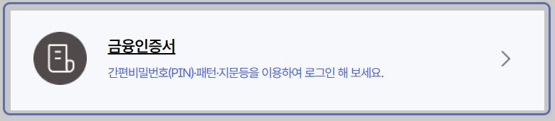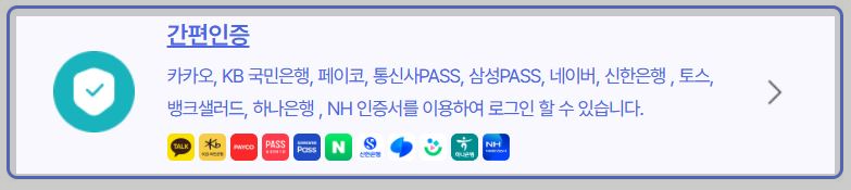 카카오, KB 국민은행, 페이코, 통신사PASS, 삼성PASS, 네이버, 신한은행 , 토스, 뱅크샐러드, 하나은행 , NH 인증서를 이용하여 로그인 할 수 있습니다. 카카오톡으로 인증 KB국민은행으로 인증 페이코로 인증 통신사패스 인증 삼성패스로 인증 네이버로 인증 신한은행으로 인증 토스로 인증 뱅크샐러드 인증 하나은행 인증 농협