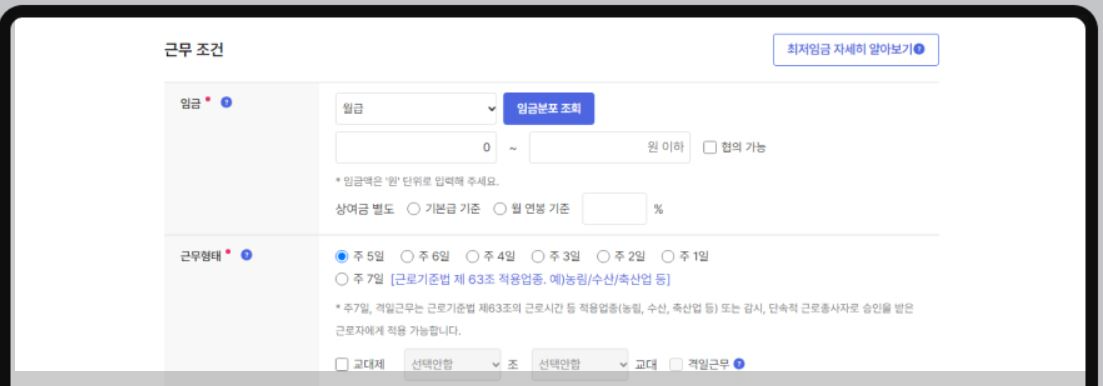 임금, 식사(비) 제공, 근무형태, 근무시간, 근무예정지, 교통편, 퇴직급여, 사회보험, 고용 형태를 입력하는 영역입니다.