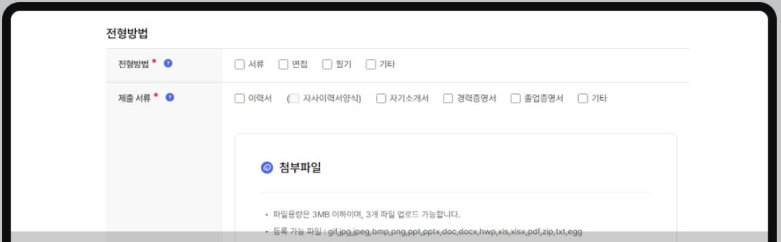전형방법, 제출방법, 제출마감일을 입력하고 제출서류를 첨부하는 영역입니다.