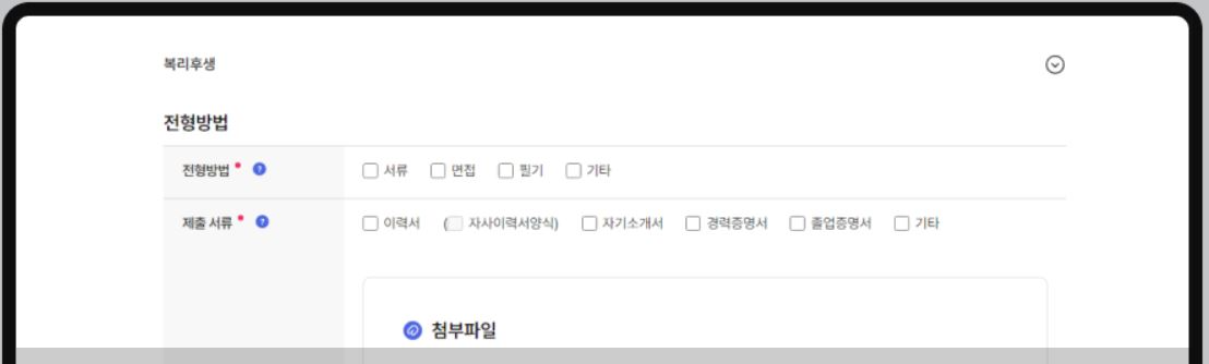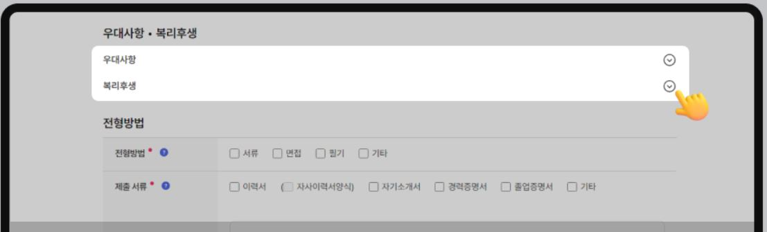 우대사항 및 복리후생을 입력하는 영역으로, 우측 화살표를 클릭하면 해당 영역의 입력 항목이 노출됩니다.