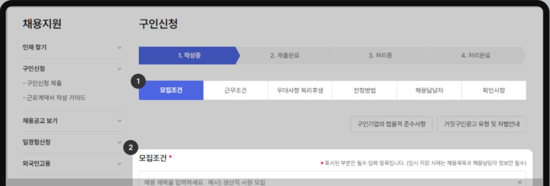 구인신청 등록을 위해 입력해야 하는 영역을 안내하는 버튼입니다. 현재 입력하고 있는 영역에 표시됩니다.