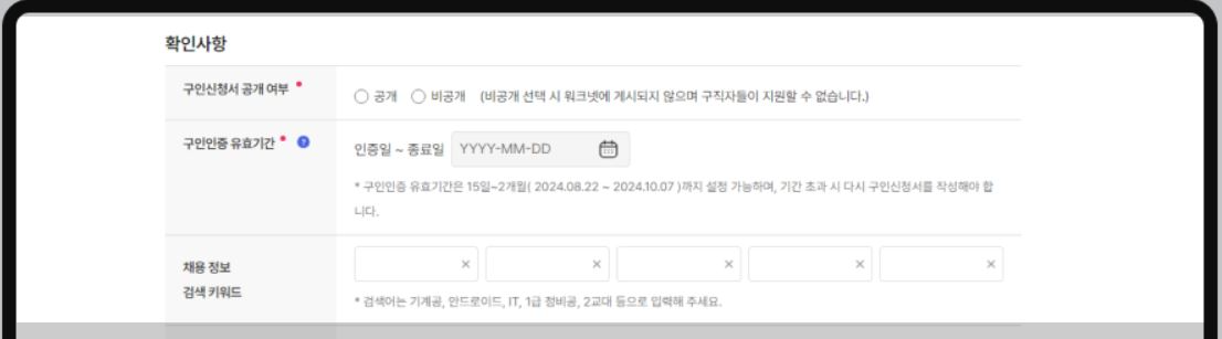 구인신청서 공개 여부, 구인인증 유효기간, 채용 정보 검색 키워드, 채용지원 서비스 희망 여부, 장애인 채용 희망인원, 고용허가제, 병역 대체 복무자 채용, 그 밖의 희망사항을 입력하며, 관련 첨부파일을 첨부하는 영역입니다.