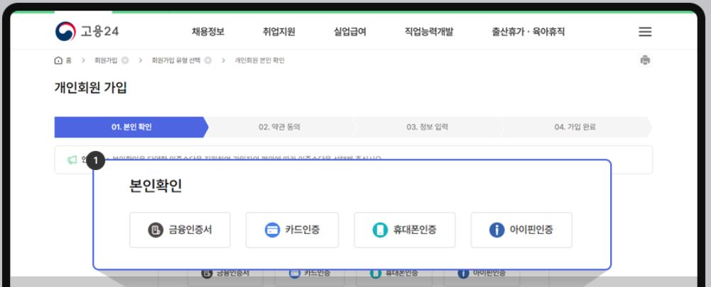 4.본인확인 수단 선택-다양한 인증수단(금융인증서, 카드인증, 휴대폰인증, 아이핀인증) 중 원하는 인증수단을 선택하여 본인확인을 진행합니다. 본인확인이 완료되면 약관동의 화면으로 이동합니다.
