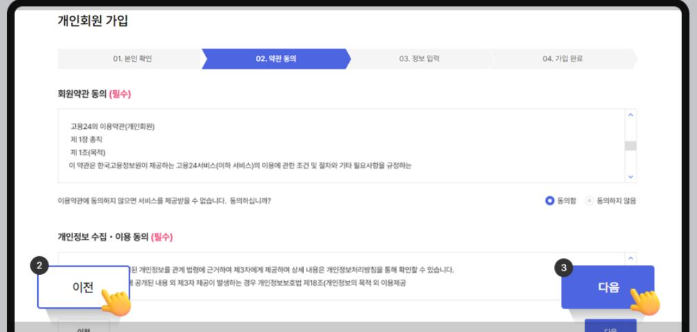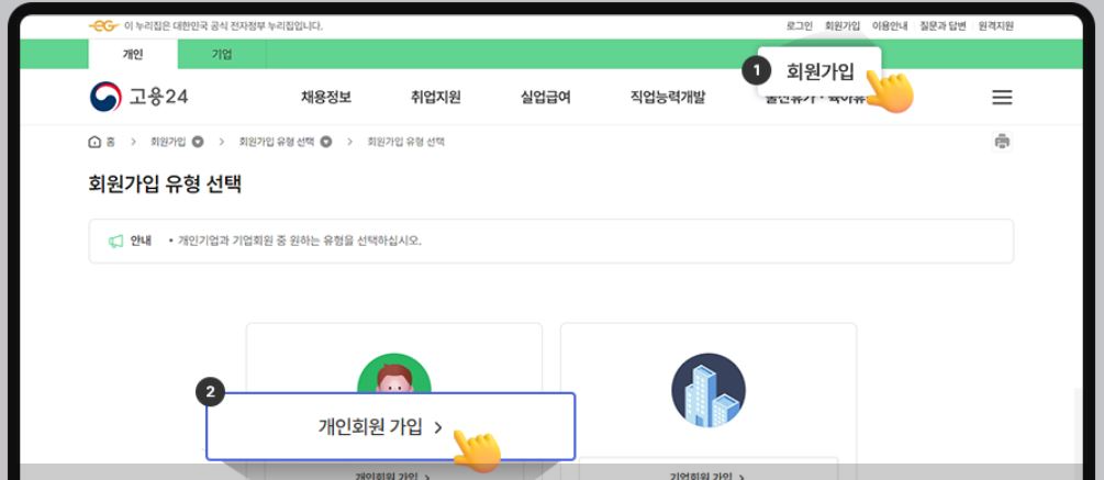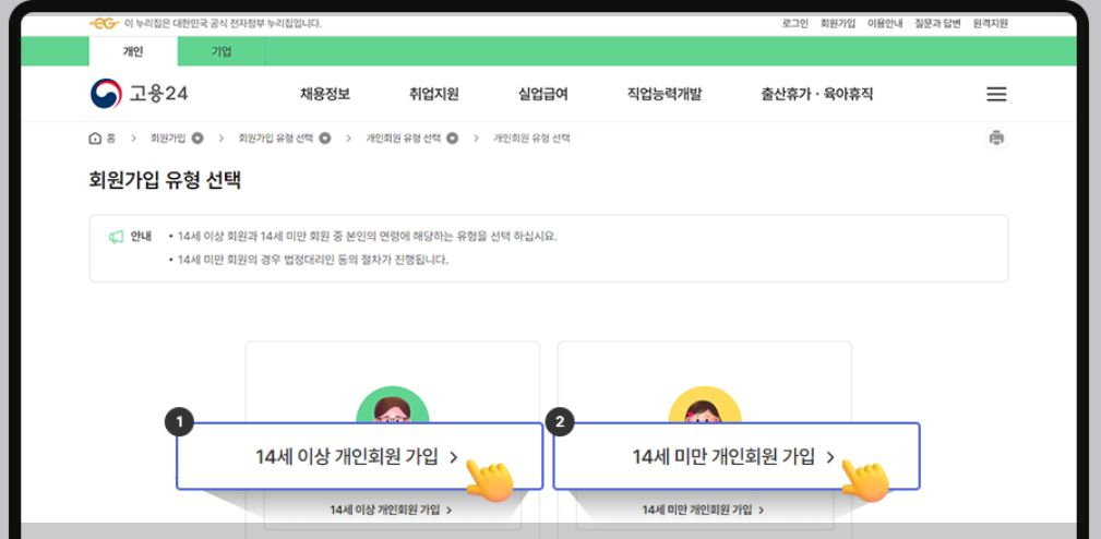 개인회원과 기업회원 중 원하는 유형을 선택하며 고용24는 고객 이용 편의성 향상을 위해 스팟콜센터를 한시적(24.11.1~12.30)으로 운영하고 있으며 회원가입 및 로그인 이용시 불편사항이 있으신 경우 아래 번호로연락하시기 바랍니다.회원가입 및 로그인 관련 문의: 070-5038-0496(유료, 운영시간:09~18시)