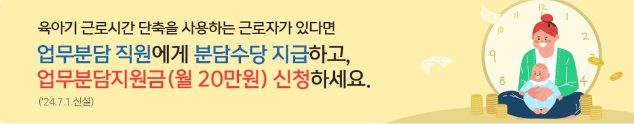 * 1명의 육아휴직, 육아기 단축 근로자에 대한 업무분담자는 최대 5명까지 지정할 수 있지만, 전체 지원액은 월 20만원을 초과할 수 없습니다.