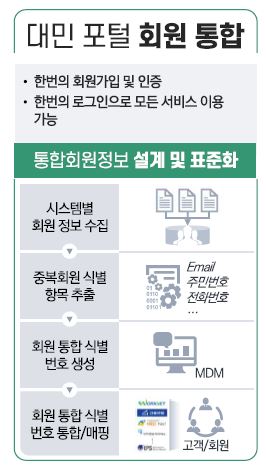 한번의 회원가입및 인증과 한번의 로그인으로 모든서비스를 이용가능해졌습니다.시스템 별 회원정보수집=>중복회원식별항목추출(미메일,주민번호, 전화번호)=>회원통합식별번호생성=>회원통합식별번호통합/매핑