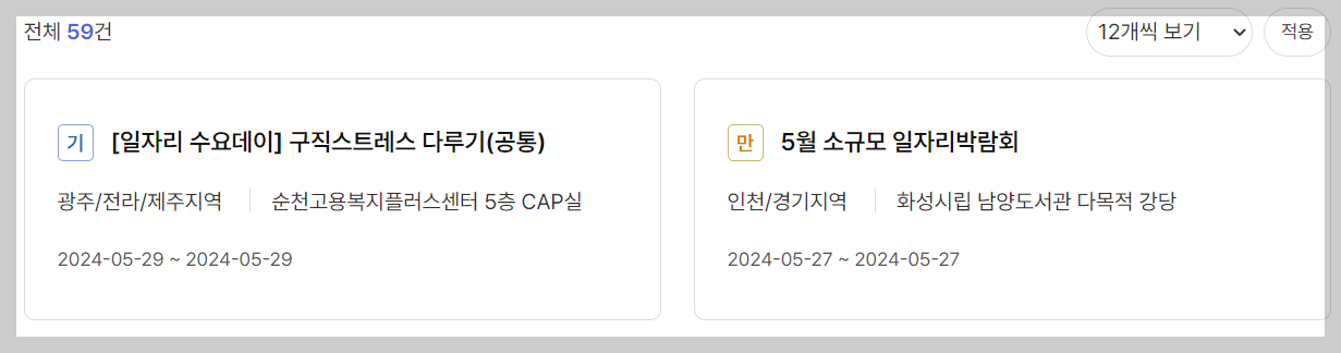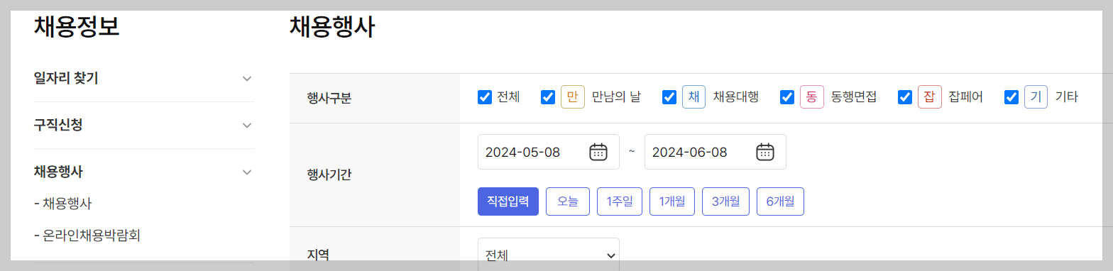 3. 채용행사에서 행사구분및 행사기간, 지역 입력하고 검색합니다.