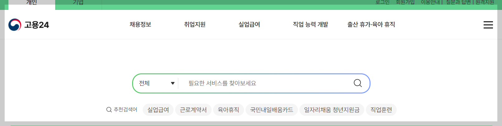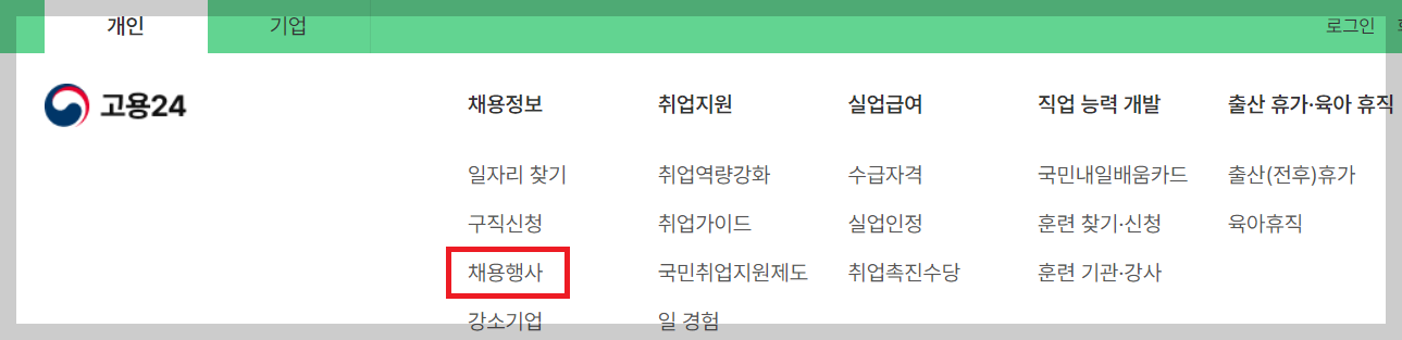2. 고용24 개인서비스중 채용정보란으로 이동합니다.