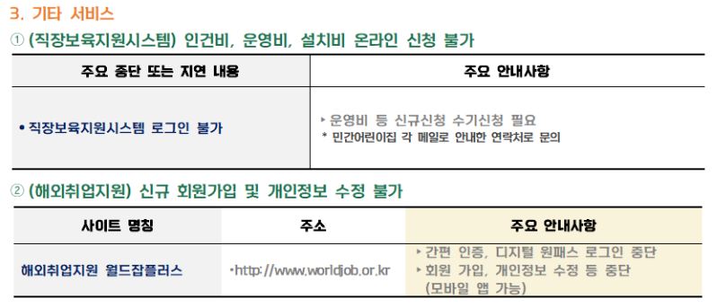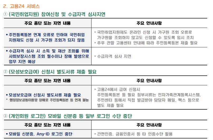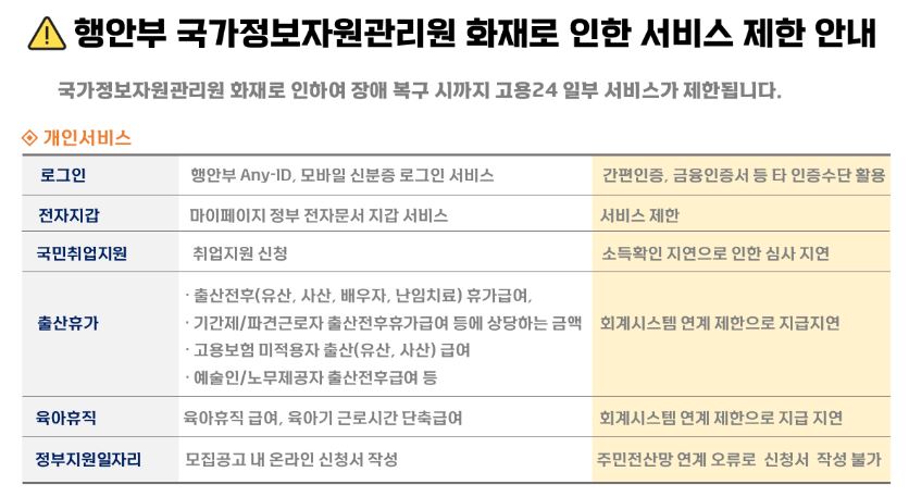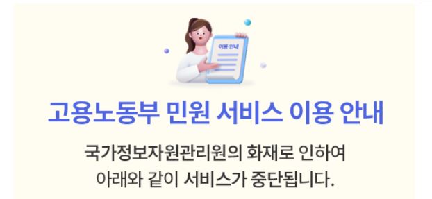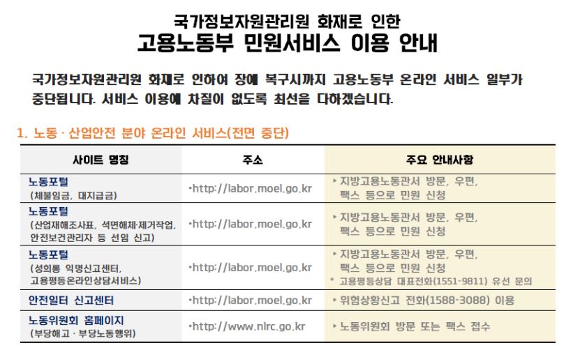 국가정보자원관리원에서 발생한 화재로 인해 고용노동부 홈페이지와 노동포털, 그리고 노동위원회 홈페이지의 서비스가 일시적으로 중단되었습니다. 이번 사고로 인해 관련 사이트에 접속이 원활하지 않거나 각종 민원 및 행정서비스 이용에 차질이 발생할 수 있습니다. 정부는 신속한 복구를 위해 전력을 다하고 있으며, 복구 완료 전까지 일부 서비스는 제한될 수 있으니 이용자께서는 참고해 주시기 바랍니다. 긴급히 필요한 민원이나 행정업무는 가까운 고용센터 및 노동위원회 오프라인 창구를 통해 확인하시기를 권장드립니다.